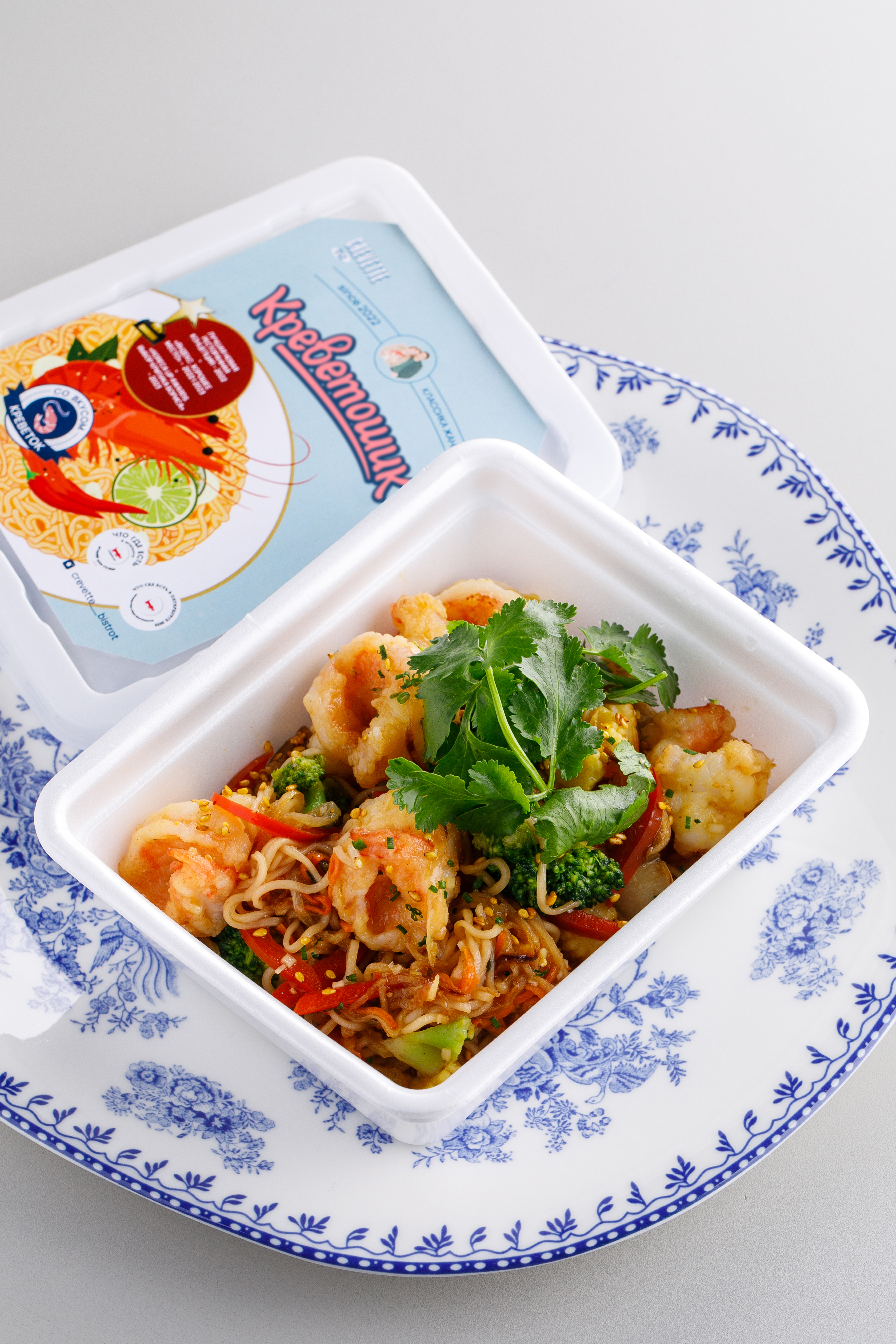 Бестселлер ресторана у моря (в креативном квартале «Брусницын» на берегу Финского залива) «Креветошик» чуть свысока передает привет любимому лоубрау-блюду «Доширак». Шеф-повар Crevettе Олег Перфилов варит кастомизированную лапшу из Вьетнама в рыбном бульоне с предварительно запанированными и обжаренными тигровыми креветками, овощами, грибами и устричным соусом.