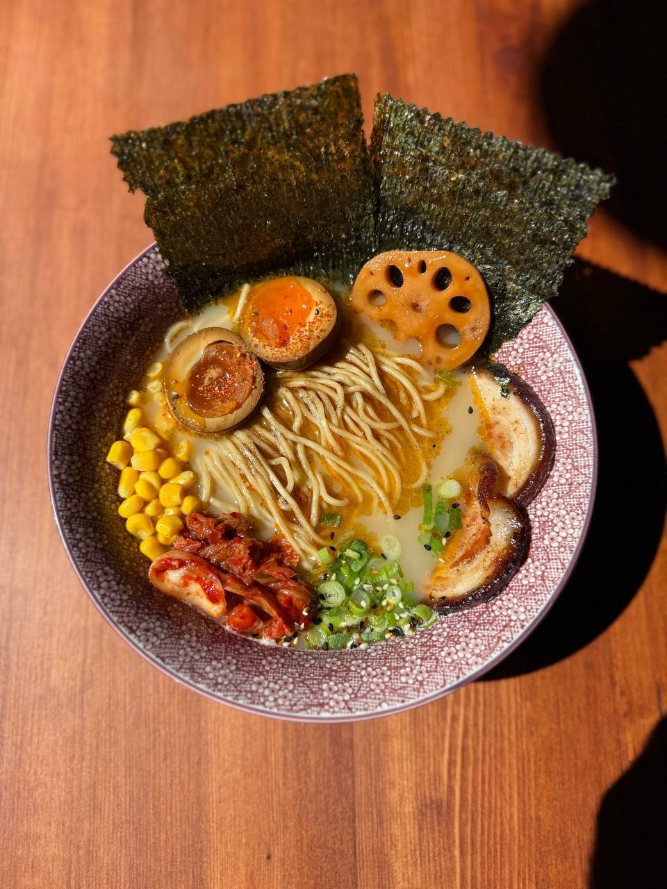 Для рамена тонкоцу шеф Петр Долгих варит плотный крепкий бульон из свиных костей (кипятит его чуть больше двух дней, чтобы получить максимум коллагена!), а затем в ход идут тясю, маринованные яйца, корень лотоса, кукуруза и высокощелочная домашняя лапша. Производство лапши в Kazoku вообще вывели на новый уровень: назвались Ramen Dealers и отгружают Дмитрию Блинову в Duo Asia!