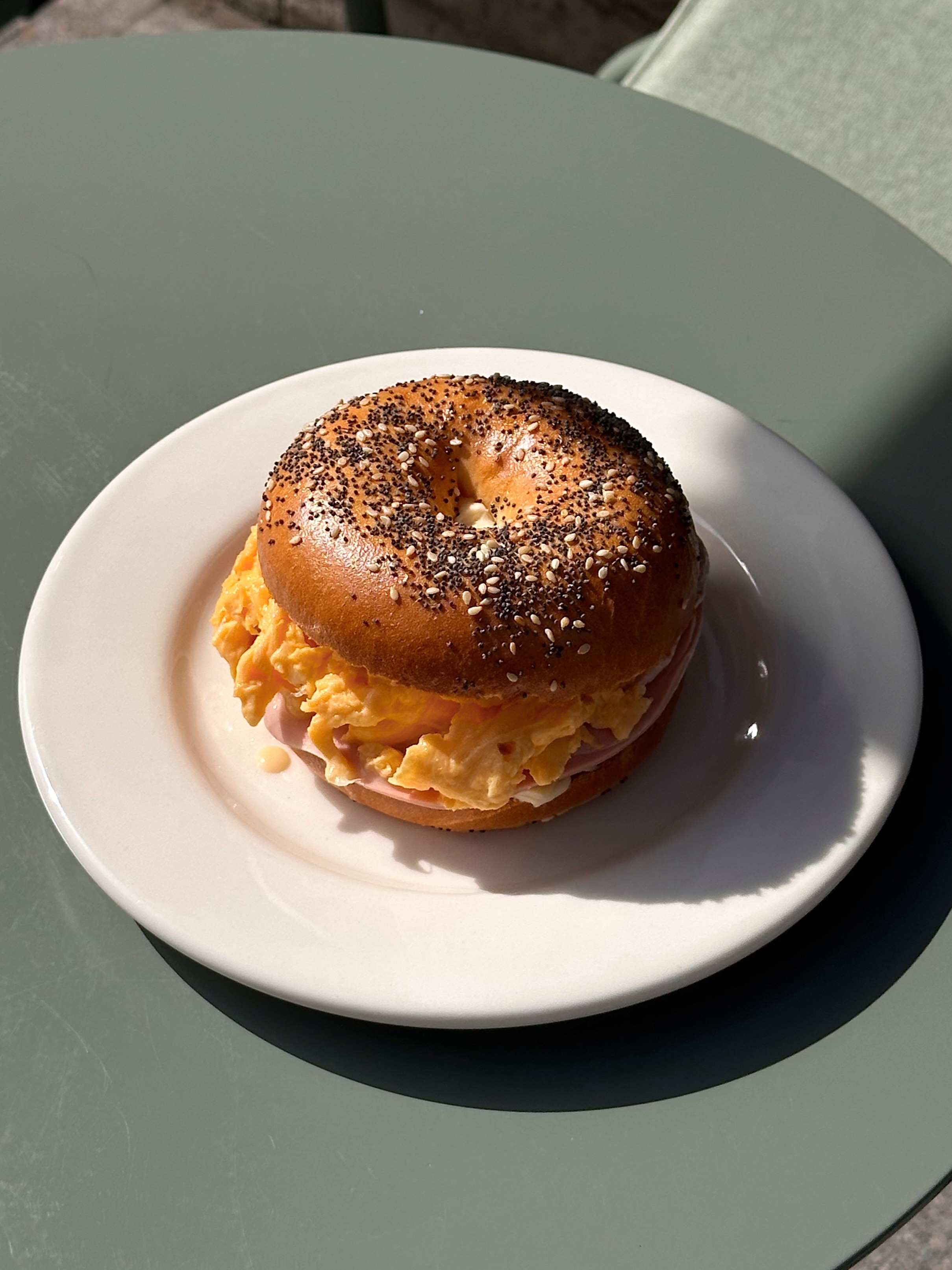 Команда Kona, что занимает угловой зал в Mozzarella Bar на Петроградской, осенью 2024-го перезапустились в новом формате: теперь завтраки с бейглами собственного производства сервируют весь день. И это прекрасно: мягкий, в щедрой посыпке из мака и кунжута бейгл идет с начинками — нажористый ростбиф с коул слоу и трюфельным айоли или с маасдамом, пармезаном и ностальгической докторской колбасой из детства. А брутальный пекарь Эд Бартош добавляет немного дэт-метала в булки — пробуем пончик с кардамоном и кремом пломбир-матча.